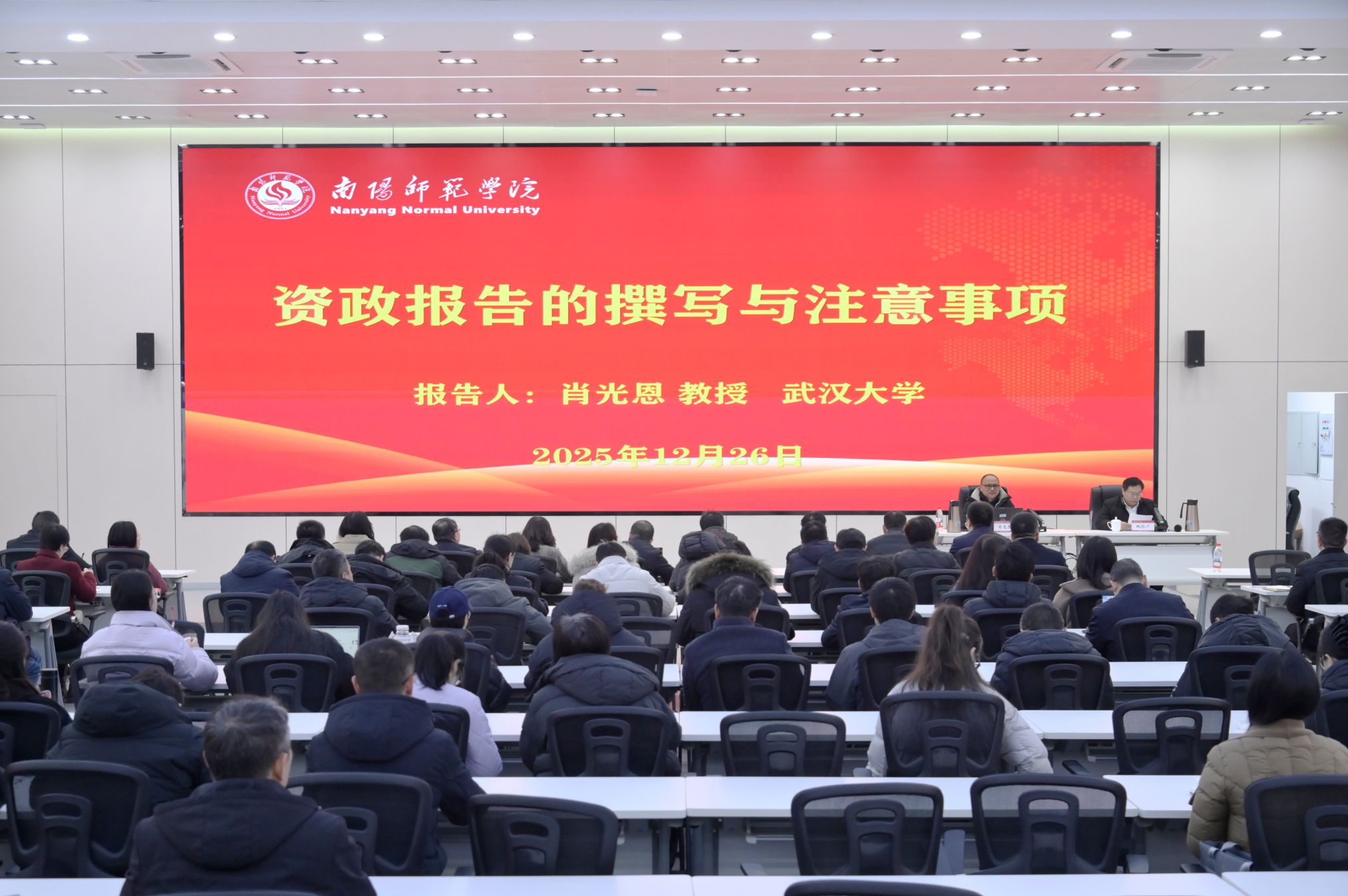 12月26日上午,武汉大学肖光恩教授应邀在我校科技楼一楼学术报告厅作题为《资政报告的撰写与注意事项》的学术报告。报告会由副校长姚伦广主持,相关职能部门负责人、各学院科研工作负责人及学术骨干参会。姚伦广在致辞中代表学校对肖光恩教授表示欢迎,并简要介绍了其学术成就。他指出,资政报告是中国特色新型智库服务决策的重要形式,肖光恩教授在该领域经验丰富、建树颇丰,此次报告将为我校教师提升资政建言能力提供重要指导。肖光恩教授围绕资政报告的定位、质量标准、撰写要点与报送途...