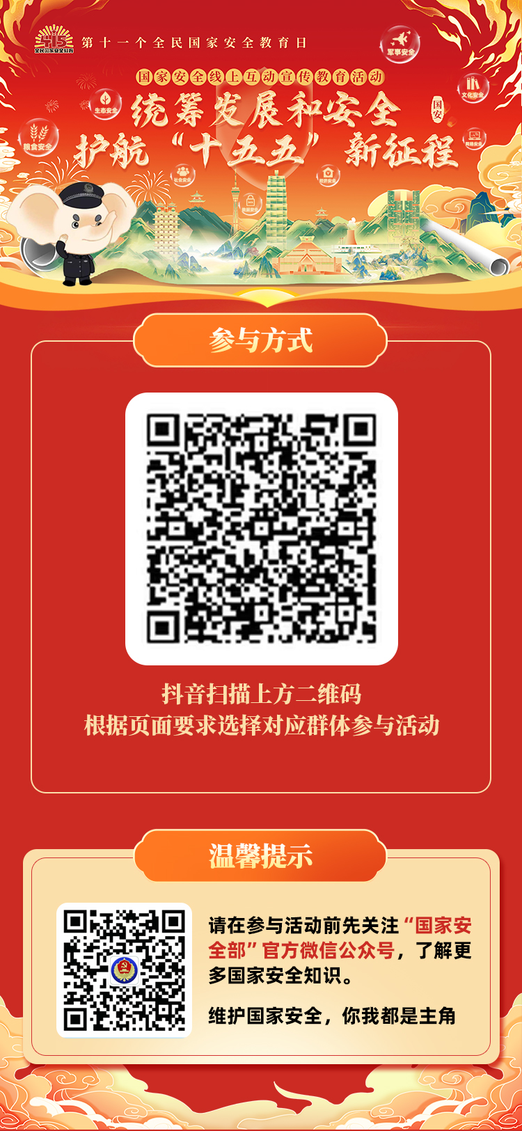 今年4月15日是第十一个全民国家安全教育日,河南省重磅推出“统筹发展和安全 护航‘十五五’新征程”线上互动宣教活动,旨在进一步强化学校师生的国家安全意识,推动国家安全理念深入人心。为确保活动有序开展、取得实效,请各单位认真组织师生参与本次线上互动宣教活动,具体安排如下: