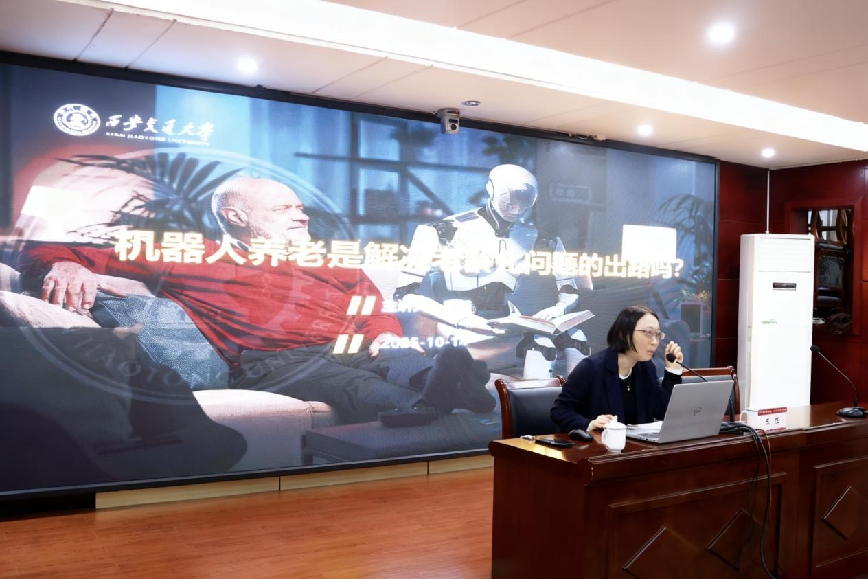本网讯(丁士瑞/文 马黎瑛子/图)2025年10月14日下午,西安交通大学王珏教授应我校马克思主义学院邀请,在办公楼一楼东会议室以《机器人养老是解决老龄化问题的出路吗?》为题开展学术报告。本次学术报告由马克思主义学院副院长牛田盛主持,马克思主义学院全体研究生参加。
