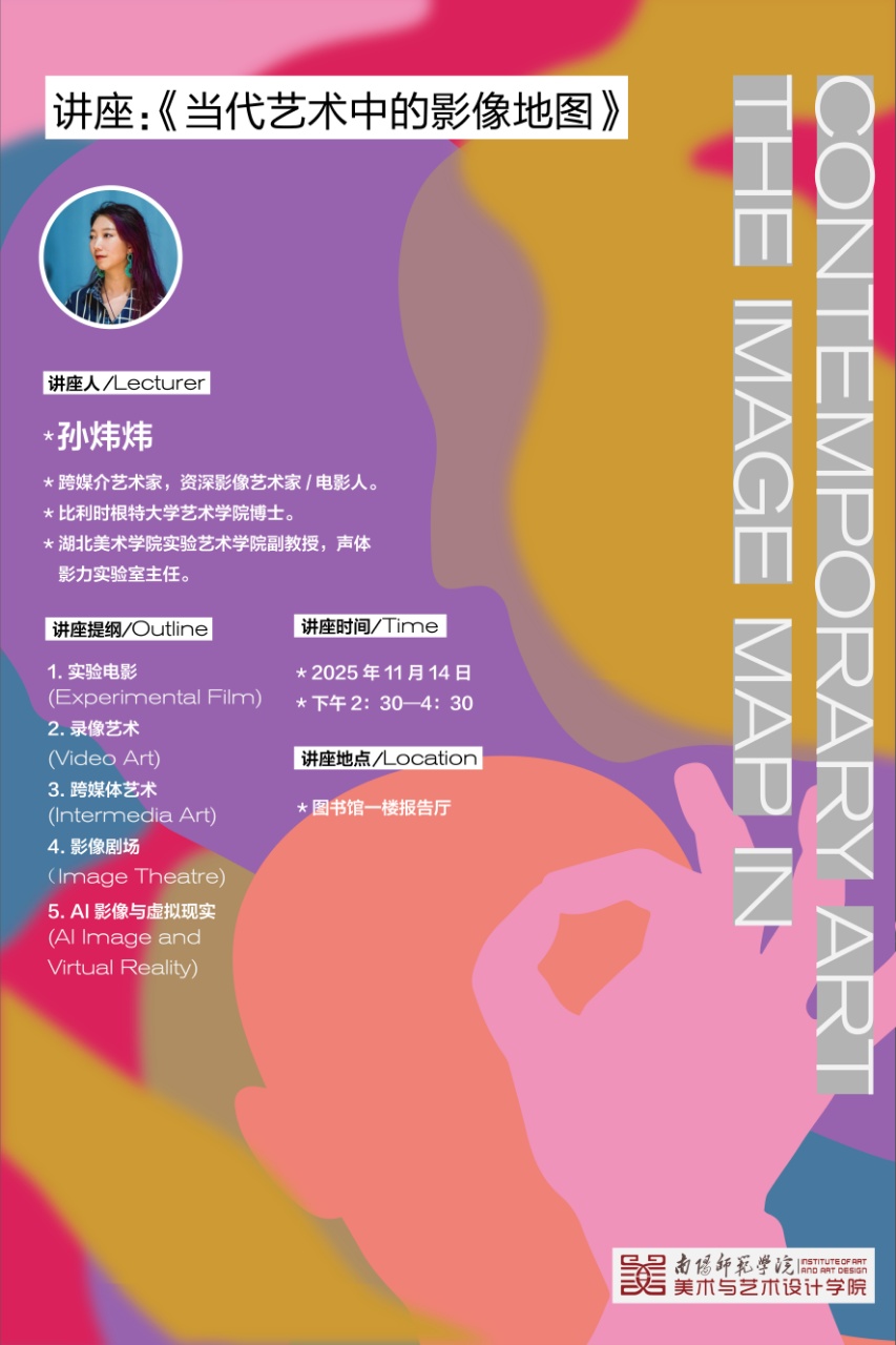 报告人简介:孙炜炜,跨媒介艺术家,资深影像艺术家/电影⼈。湖北美术学院实验艺术学院副教授,声体影⼒实验室主任。