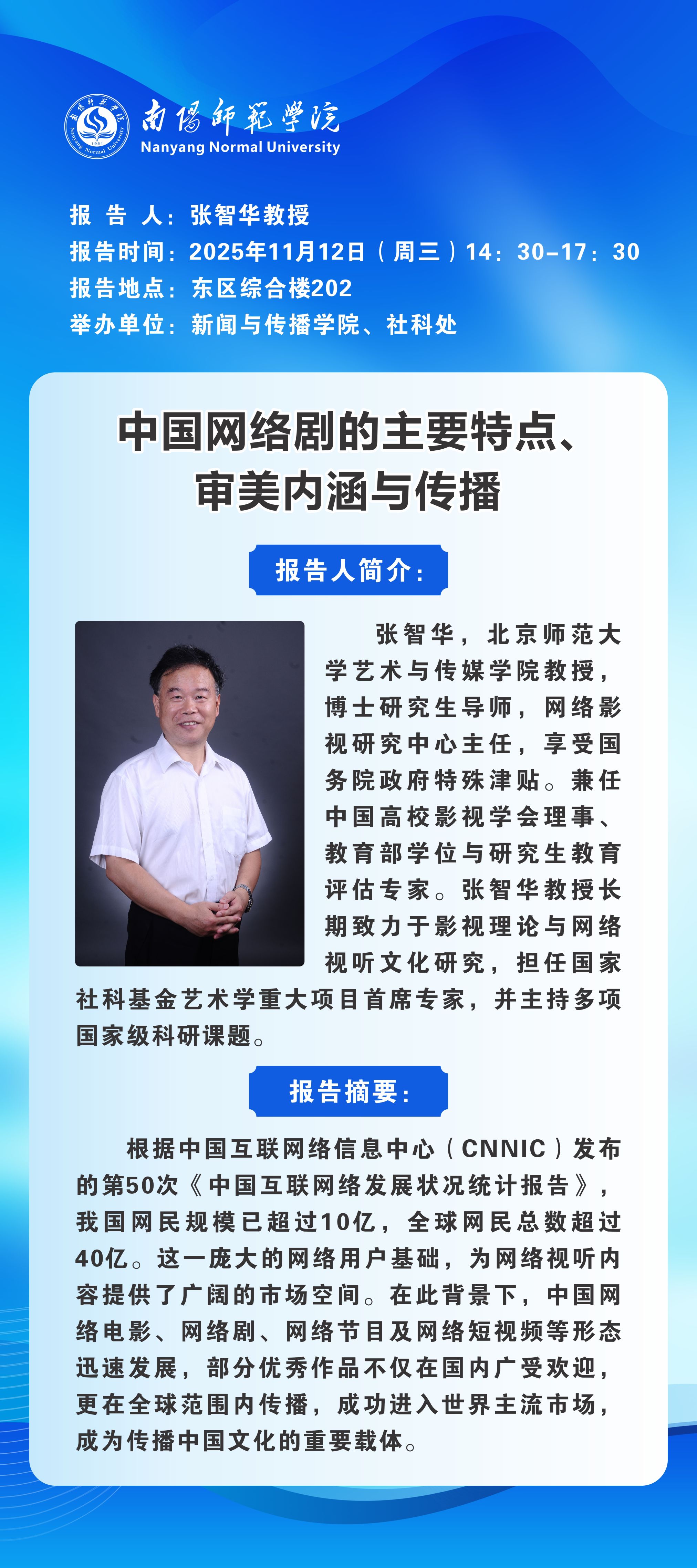 报告人简介:张智华,北京师范大学艺术与传媒学院教授,博士研究生导师,网络影视研究中心主任,享受国务院政府特殊津贴。兼任中国高校影视学会理事、教育部学位与研究生教育评估专家。张智华教授长期致力于影视理论与网络视听文化研究,担任国家社科基金艺术学重大项目首席专家,并主持多项国家级科研课题。