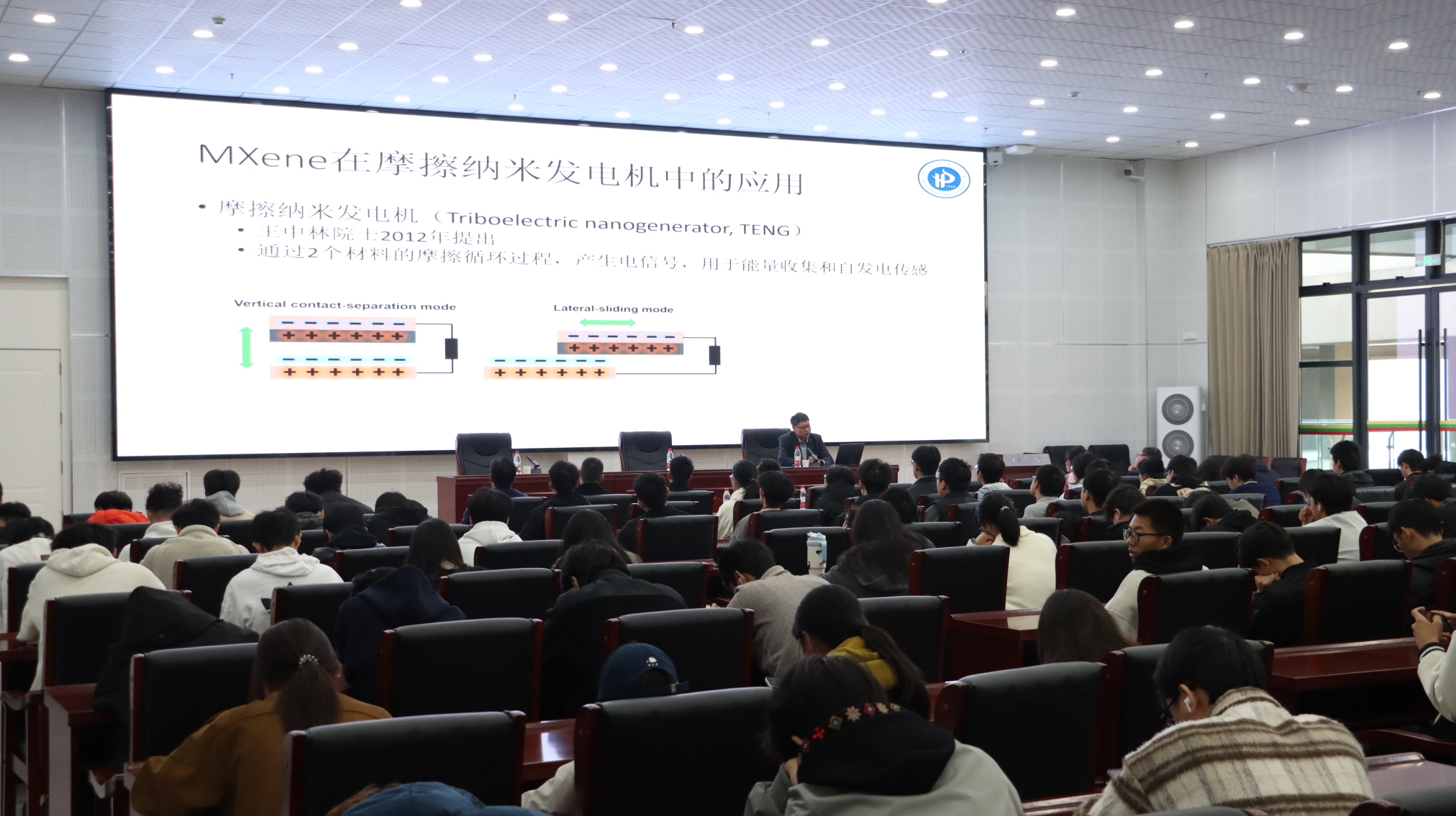 报告中,周爱国教授系统阐释了从三维MAX相到二维MXene材料的制备历程、关键技术及应用前景,并重点介绍了其团队在高性能摩擦纳米发电机(TENG)构建方面的突破。该研究利用MXene优异的导电与柔韧性,开发出可用于应变传感的器件,为柔性电子皮肤、可穿戴设备等领域提供了新思路。 互动环节气氛热烈,师生围绕MXene的规模化制备、产业化挑战与发展趋势踊跃提问,周教授细致解答,现场掌声不断。 随后,周教授与学院教师举行科研座谈会,结合自身经验分享了国家自然科学基金申报技巧,并就项目申请、论文写作、研究生培养等实际问题,为青年教师提供了针对性指导。与会教师表示收获丰富,对今后科研与教学工作具有重要启发。