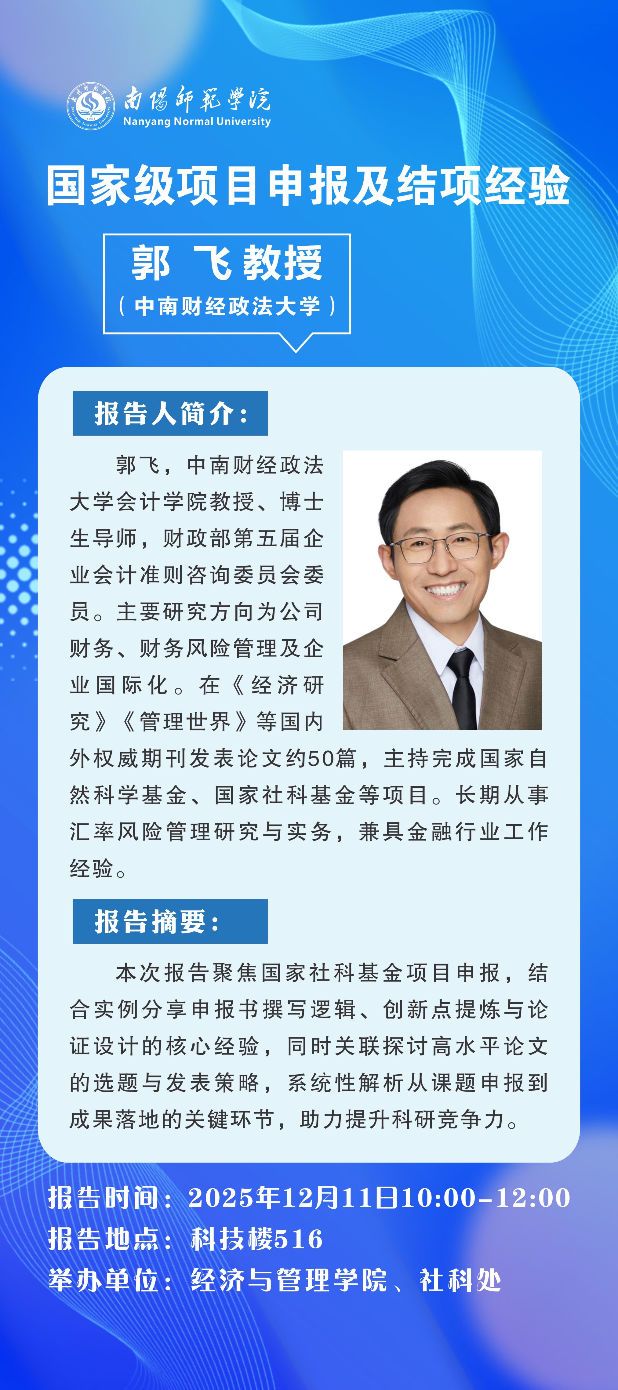 报告摘要:本次报告聚焦国家社科基金项目申报,结合实例分享申报书撰写逻辑、创新点提炼与论证设计的核心经验,同时关联探讨高水平论文的选题与发表策略,系统性解析从课题申报到成果落地的关键环节,助力提升科研竞争力。