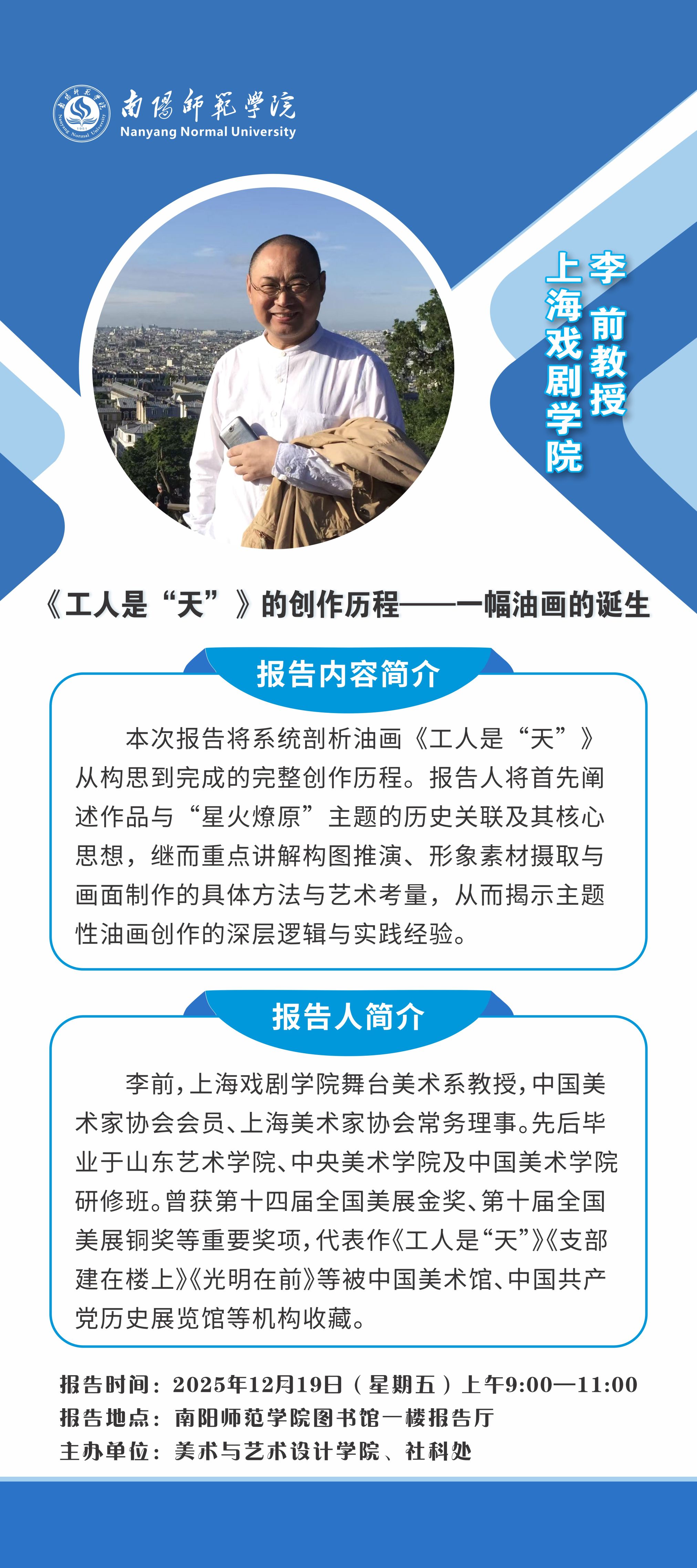 报告内容简介:本次报告将系统剖析油画《工人是“天”》从构思到完成的完整创作历程。报告人将首先阐述作品与“星火燎原”主题的历史关联及其核心思想,继而重点讲解构图推演、形象素材摄取与画面制作的具体方法与艺术考量,从而揭示主题性油画创作的深层逻辑与实践经验。