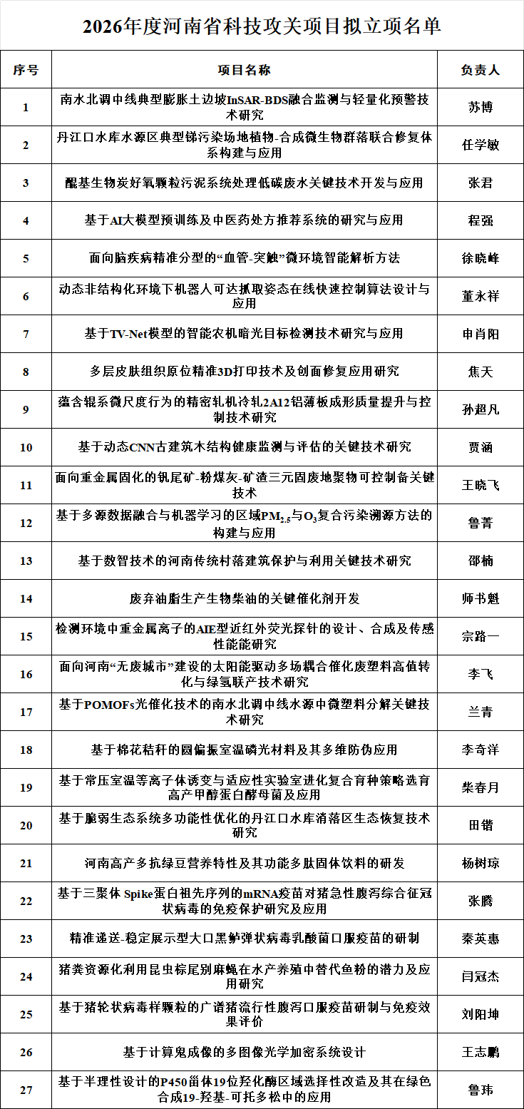 本网讯(通讯员 杨仕伟 张 浩)近日,河南省科技厅公布了2026年度河南省重点研发专项和科技攻关项目立项结果。继李玉英、段鹏飞和李丹丹老师之后,惠明老师于今年再次获批重点研发专项,我校取得了连续四年获批该类项目的佳绩;张英君老师作为联合申报人参与的外单位同类项目也成功获批。同时,我校共有27个科技攻关项目获批立项,立项率75.0%,获经费资助项目数创历史新高,且在全省师范类高校位居前列。