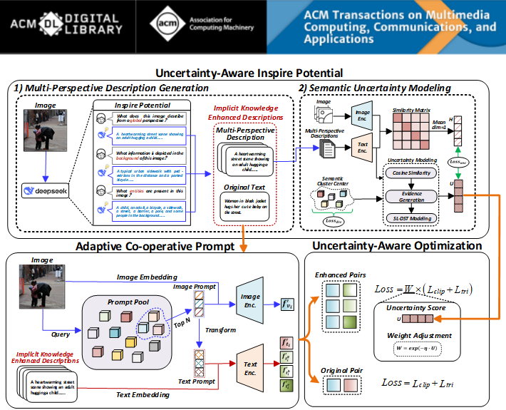 本网讯(通讯员 黄鑫 张淼)近日,人工智能学院大数据与人工智能团队与北京大学、华北电力大学的合作研究成果《Adaptive Co-operative Prompting and Uncertainty-Aware Implicit Knowledge Enhancement for Cross-Modal Retrieval 》被国际期刊ACM Transactions on Multimedia Computing, Communications, and Applications (TOMM)录用。论文第一作者为我校黄鑫博士,第二作者为我校硕士研究生王世龙,通讯作者为我校李菁菁博士,南阳师范学院为第一通讯单位。TOMM是国际计算机学会(ACM)出版的 Transactions 系列期刊,其JCR分区为Q1,是多媒体领域的顶级国际期刊,也是中国计算机学会(CCF)推荐的B类国际期刊。
