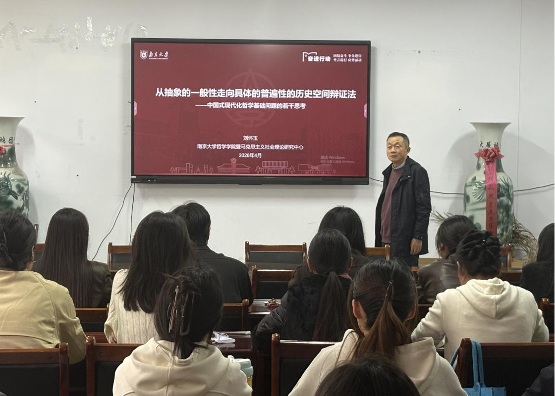 本网讯(通讯员 李新士)2026年4月2日下午,应马克思主义学院邀请,南京大学二级教授、博士生导师刘怀玉在逸夫楼S105会议室作题为《从抽象的一般性走向具体的普遍性的历史空间辩证法——中国式现代化哲学基础问题的若干思考》的学术报告。报告会由马克思主义学院副院长牛田盛主持,学院部分教师及全体研究生到场聆听。