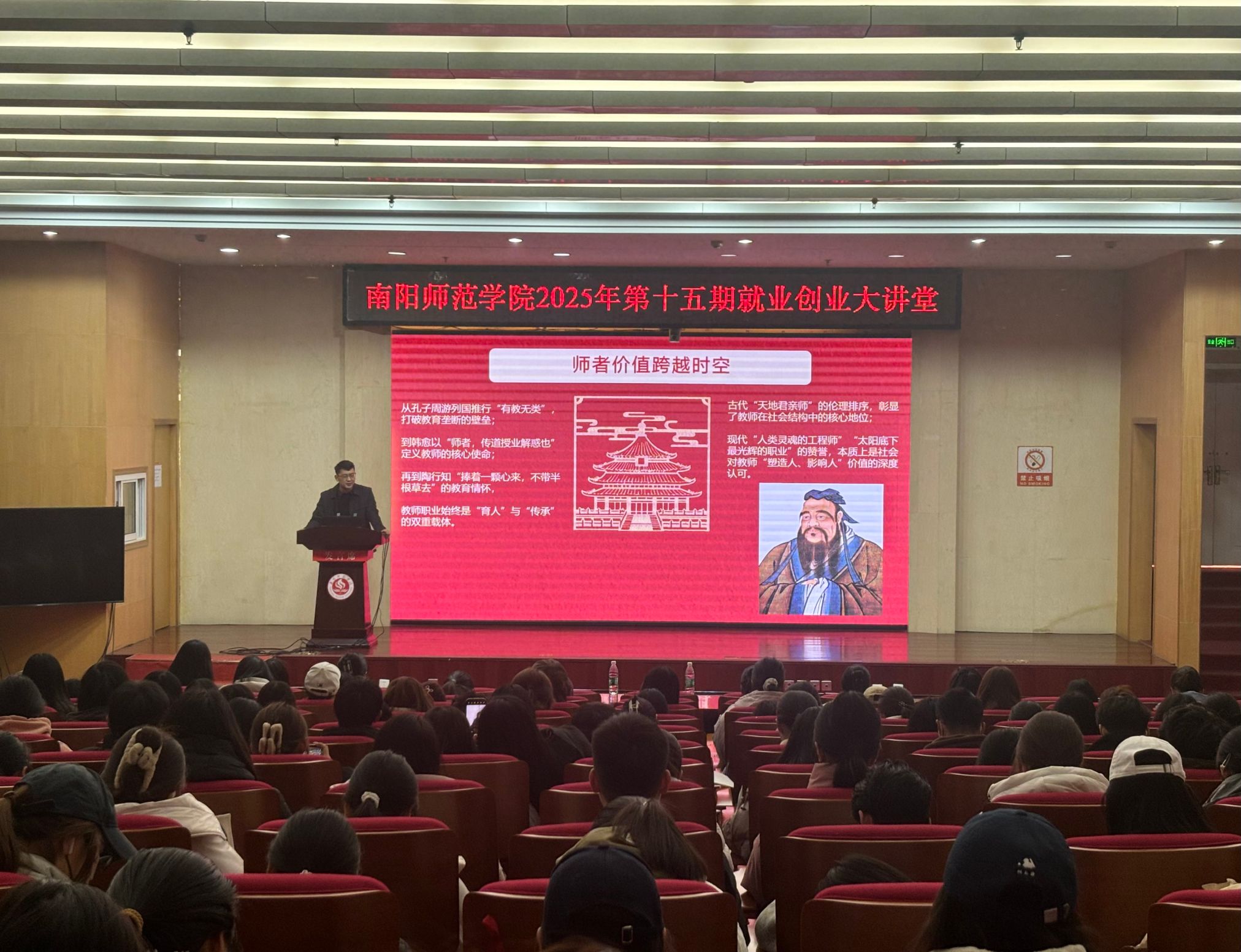 本网讯(宋自鸽 王佳慧/文 张馨雅/图)为帮助学生明确职业目标,树立正确的就业观,科学规划学业与职业发展路径,11月28日,由创新创业学院主办、马克思主义学院承办的第十五期就业创业大讲堂在图书馆一楼报告厅举办。本次讲堂由南阳市第五完全学校高中部主任王乐天老师担任主讲嘉宾。马克思主义学院200余名学生代表参加。