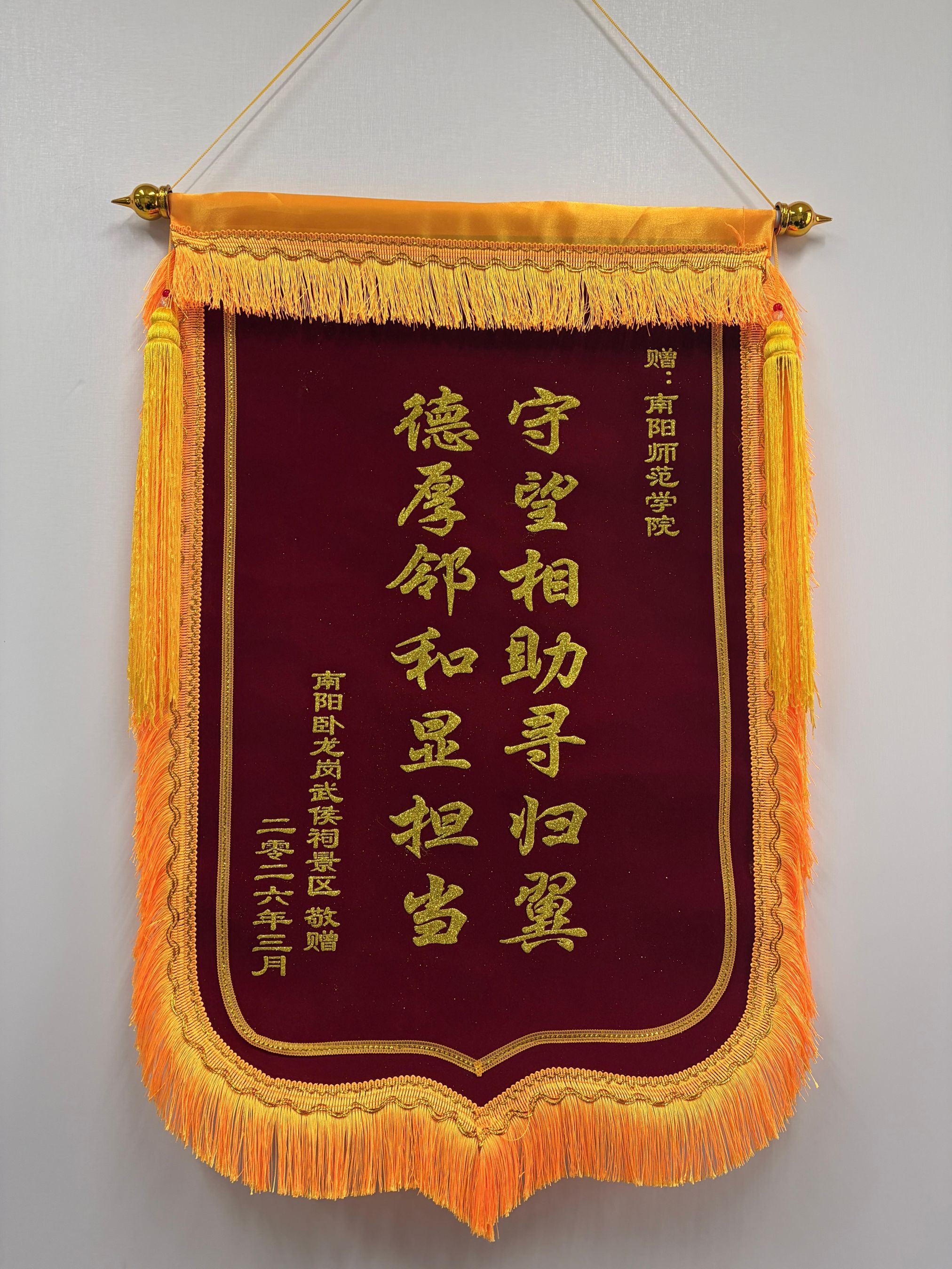 本网讯(王珂/文 王焱/图)近日,我校收到南阳市卧龙岗武侯祠景区送来的锦旗,对学校在春节期间无人机突发事件中快速处置、全力相助表示感谢。