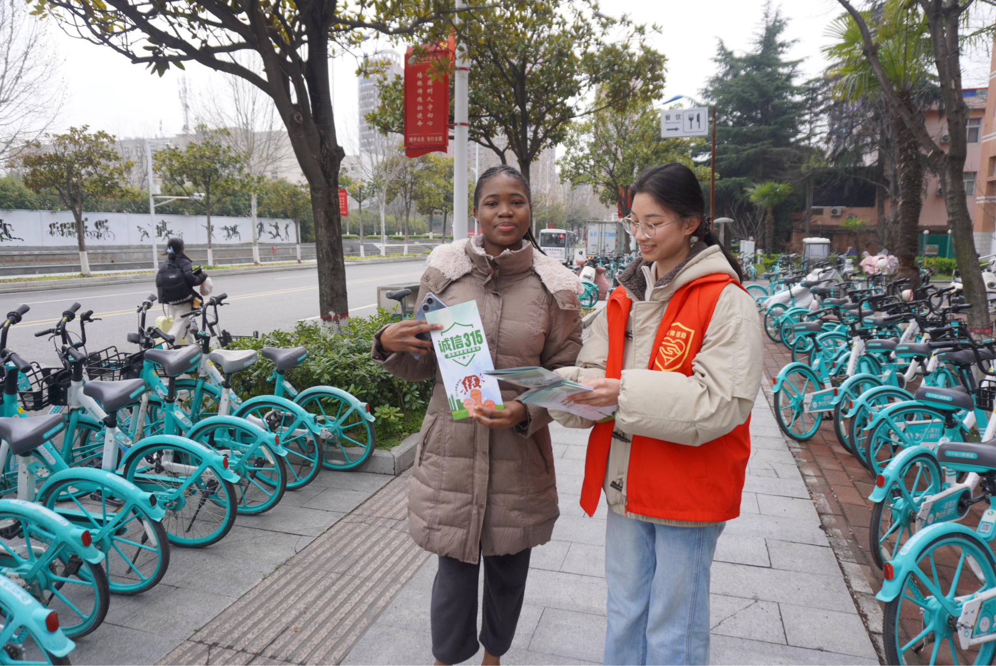 中午,志愿者们在中区餐厅门口,通过发放普法手册、3·15趣味绕口令、法律知识答题等形式,将消费维权知识送到师生身边。活动现场气氛热烈,志愿者为同学们讲解维权要点,同时也为餐厅工作人员普及相关法律知识;更有外国友人主动驻足交流,让法治宣传跨越语言与国界,真正贴近每一位校园成员,展现了开放包容的校园氛围。