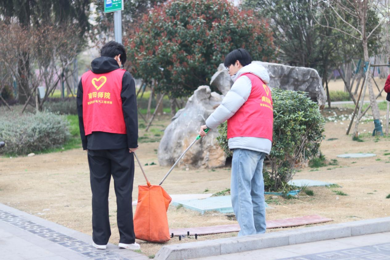 3月14日,智能制造与电气工程学院赴南阳市申伯公园开展“知行筑绿·生态研学”生态保护活动。志愿者现场统筹分工,有序开展清洁行动,保障志愿服务有序推进。期间,志愿者主动向游园市民宣讲文明游园、爱护花木的环保理念,带动市民共同守护公园优美环境。