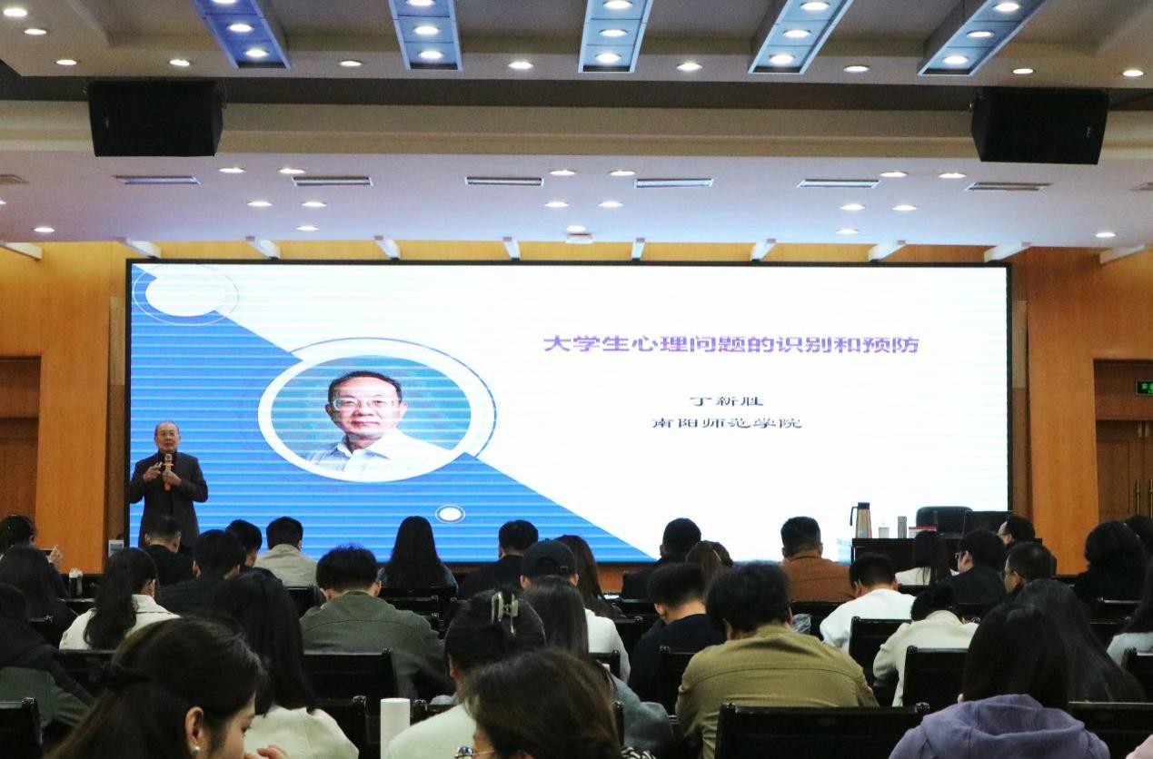 本网讯(李丹煜/文 周嘉雯/图)为落实新时代学生心理健康工作要求,强化学生工作队伍专业能力建设。4月9日下午,我校在科技大楼三楼会议室召开2026年春期学工队伍心理工作培训会。培训会邀请原南阳师范学院教育科学学院院长丁新胜教授主讲,全体学工队伍教师参加培训。会议由学生发展中心(心理健康教育与咨询中心)主任程果主持。