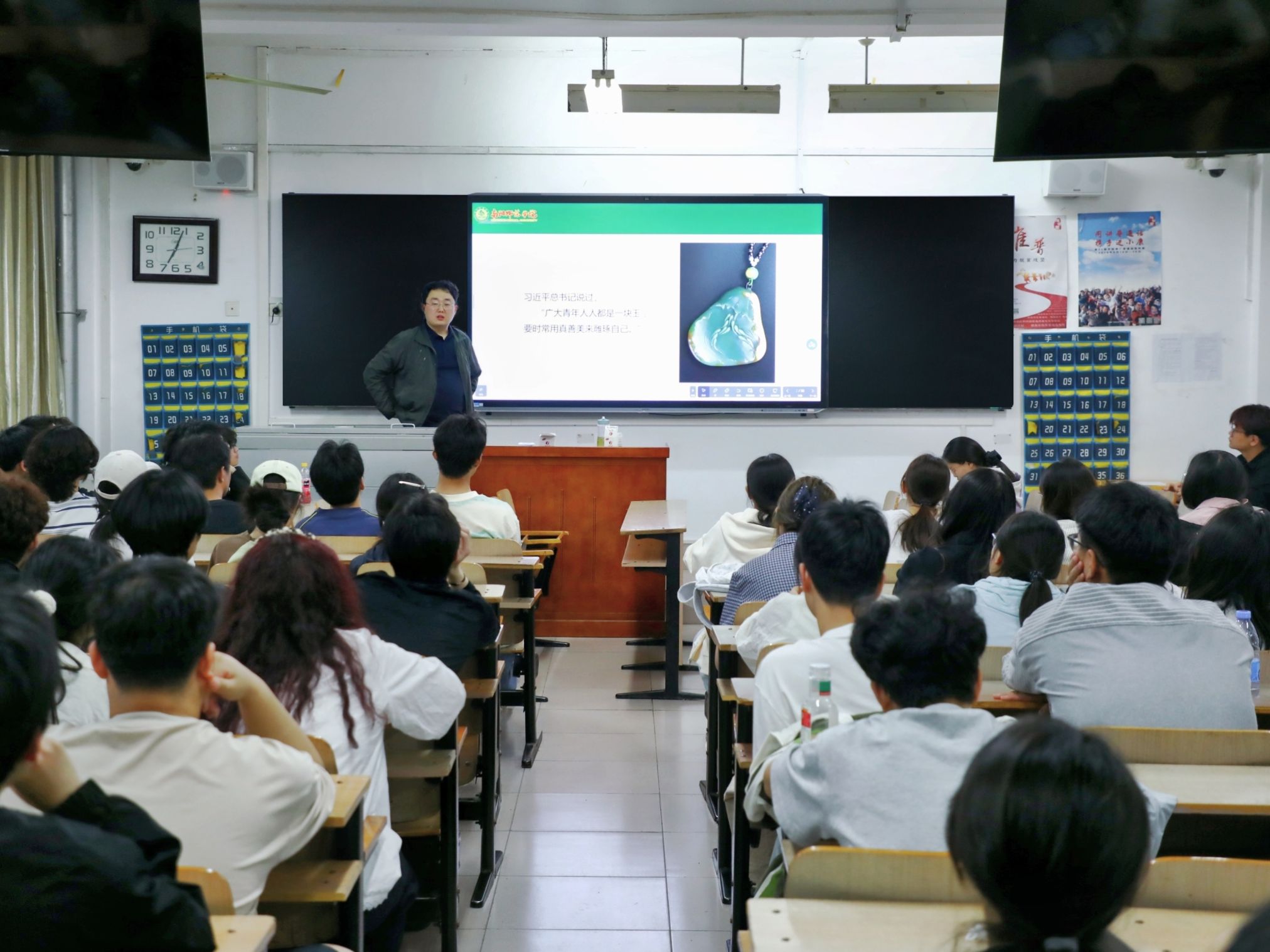 叶旭围绕玉的五种美好品质展开讲解,系统阐释玉的起源与历史文化价值。梳理玉石文化发展的四大历史时期,分享南阳独山玉的发掘历程与文物收藏价值,让同学们深刻体会玉石之珍贵。他以玉喻德、以文化人,带领大家感受玉文化独特魅力的同时,接受了一场生动深刻的品德教育。叶旭将玉之五德与青年修身立德相结合,勉励同学们以玉为范、涵养品格,表示玉文化对新时代大学生品德修养与价值塑造具有重要指引作用。