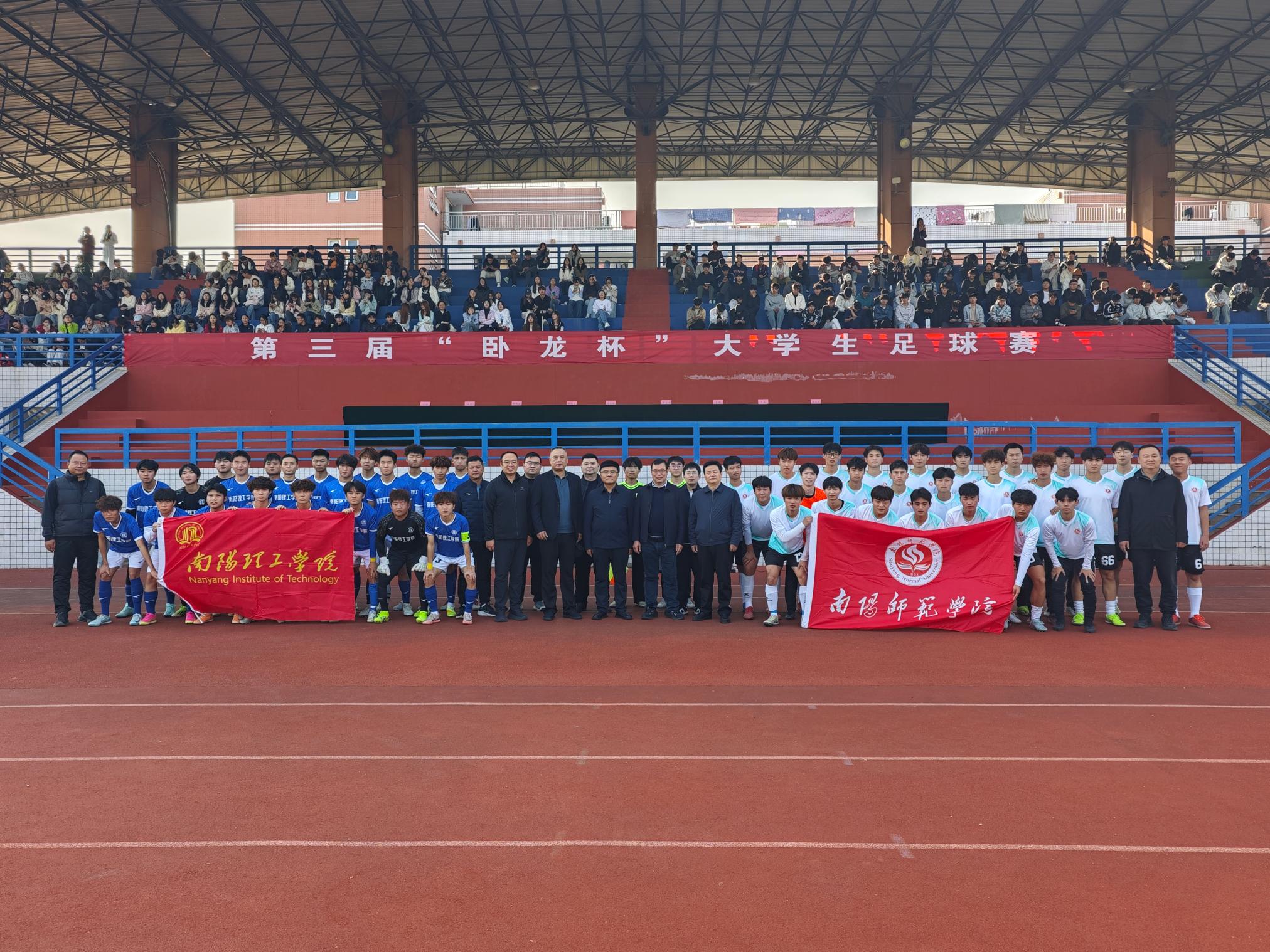 本网讯(杨眉 马海菡/文 尚梦媛 马海菡/图)为丰富校园体育文化活动,增强同学们的综合素质,加强南阳高校校际交流,传承体育精神,10月30日下午,第三届“卧龙杯”大学生足球赛在我校中区田径场举行。校党委副书记刘红林、南阳理工学院副校长黄金书出席,学生处、体育学院负责同志,南阳理工学院相关负责同志,校团委同志观看此次比赛。