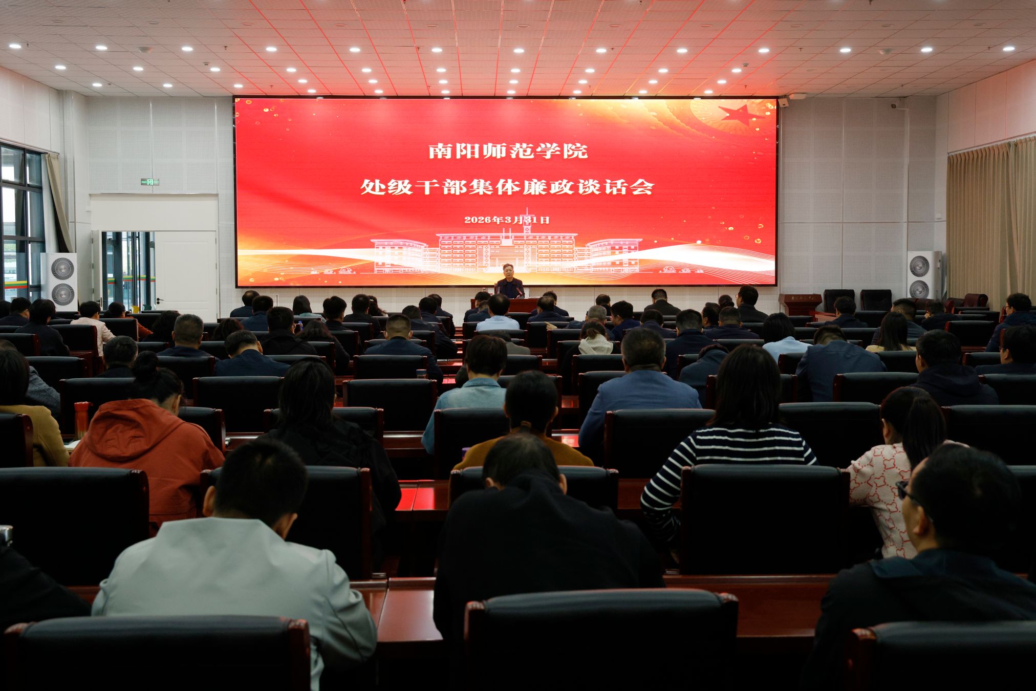 本网讯(史月婵/文 刘潇潇/图)3月31日,我校在西区留学生公寓学术报告厅召开处级干部集体廉政谈话会。校纪委书记、监察专员刘守勇出席会议并作集体廉政谈话。全体处级干部参加会议。